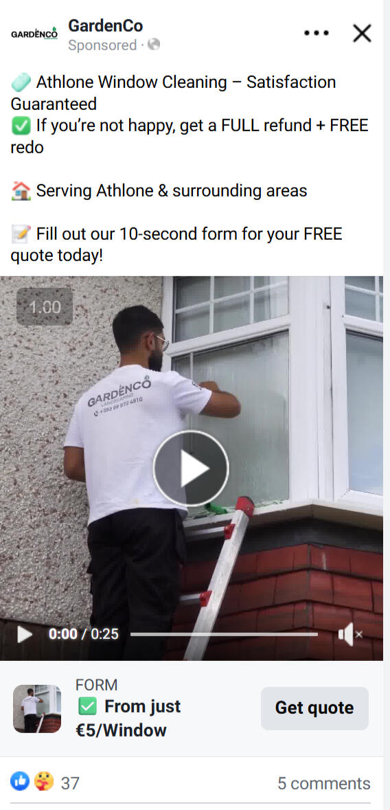 This included filming short-form video ads, running follower campaigns to build social proof, and launching Facebook and Instagram lead generation campaigns targeted to Athlone and surrounding areas.
